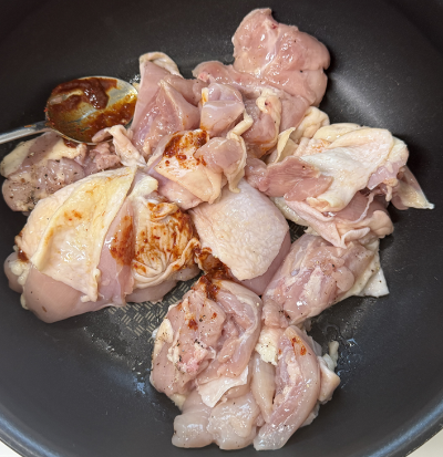 3. 양념 나중에 넣을것 남겨놓고 닭다리살 버무려서 먼저 살짝 익히기