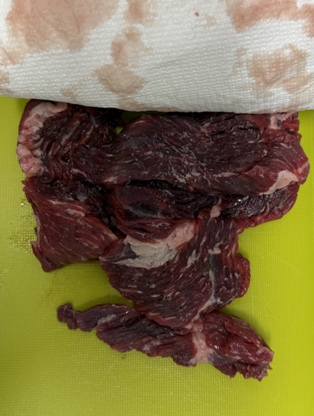 2. 미역을 불리는동안 키친타월로 소고기의 핏기를 제거하고 먹기 좋은 크기로 썰어줍니다.